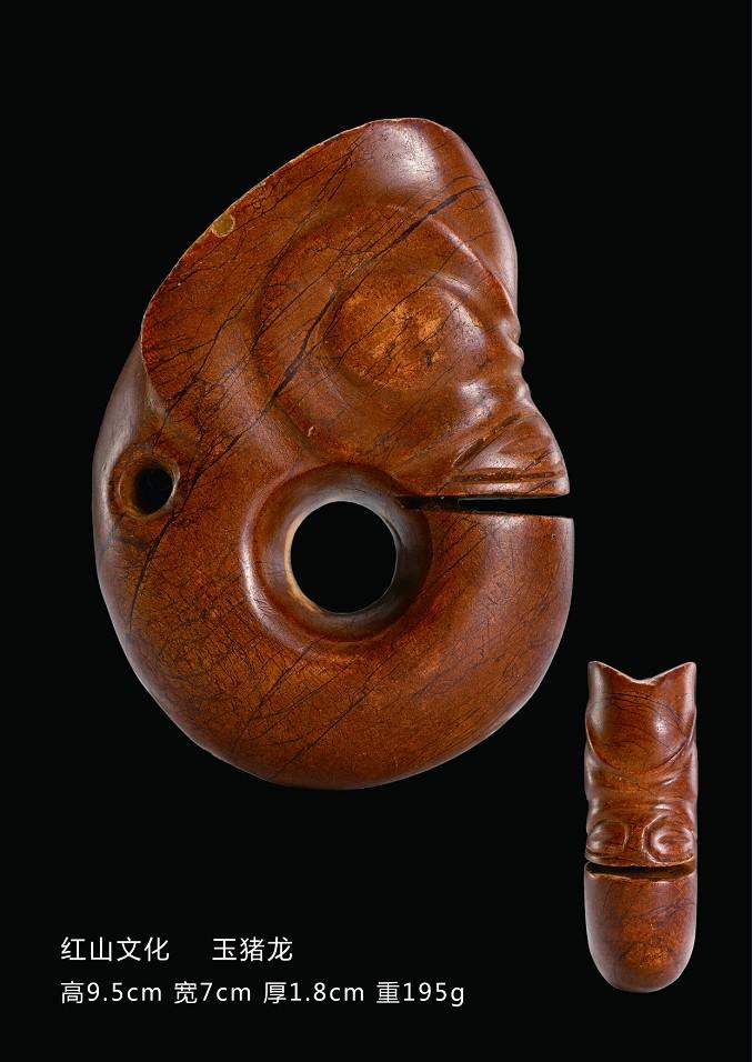 这件玉猪龙整体呈褐色,包浆浑厚,柳根纹密布,通过包浆的缺失口,强光透射器件内部玉质结构细腻、均匀、洁净,少瑕疵,借助放大镜观察玉体表面柳根纹浓密相间、玉体有通透感、黄中泛绿色。器物用去阴留阳法砣出一双大圆眼,一对大耳朵,大耳高耸,躯体成C形,靠近颈部处有一穿孔双面对钻而成,孔口呈喇叭状,通体没有硬器加工的痕迹,整件玉器完整极少缺失,是距今五千多年红山文化代表作“玉猪龙”。