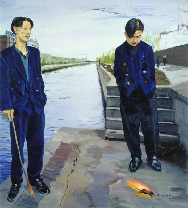 刘小东《烧耗子》画面直贯着一条缓缓流动、并不太宽,还有着河岸的河流,河岸两边并行着绿色的树木,与高处的电线杆一道,河流一直伸向远方;画的近景是两个年轻人在烧一只耗子,着火的耗子在奔跑——似乎要把自己着火的皮跑掉似的;中景是河流的左边或画的左边是一栋高耸的居民楼,右边是两个在中途偶尔相遇的人,他们似乎在交谈什么,旁边是一道围墙,与河流一道并行着伸向画的里面和背景;画的远景处有一座桥,上面有穿过的电线杆。在中景,远离两个烧耗子的年青人,在河旁的右岸边,还有一个直立的年青人面对河水,似乎在沉思什么;画面最低处的右下角是那只着火燃烧的耗子,画上部的天空中有着卷动着的几抹黑色和刷出的浮云。这是一个很日常生活的场景!可以发生在任何城市和城镇的邻近郊区的地方和白天,我们日常生活中随处可见两个这样的年轻人。当然,画面的焦点,占据画面主导部分的是两个近似真人大小(152 米高的画)的年青人!他们是年青人——穿着青灰色的西装,画面左边那个略为瘦一些的年青人是上下一套的套装,右手里拿着作为点火用而且底端还在燃烧的木棍,他的左手插在裤兜里,眼目略为低垂,嘴角带着笑意,似乎刚完成了一件杰作,右边的年轻人要略显胖一些,他的脚边是一堆杂草或者垃圾,他头低下来看着那只烧着的耗子,他也是穿着双排扣的西装,似乎这是1998 年前后中国最为流行的西装款式,他不是套装,裤子是黑色灯芯绒的,他的双手则都悠闲地放在裤兜里,他似乎是在欣赏旁边朋友的杰作,他更多的是一个观望者和欣赏者?如同那个一只手拿木棍另一只手却放在裤兜的家伙——他现在也在欣赏自己的杰作——看着那只燃烧而跳动的耗子。画家让他们的着装显出差别,尤其是裤子和手的放置,隐含了什么呢?要我们把注意力转向这个裤子下面燃烧的耗子?他们的头发都是中间分开的分头,两个家伙看起来有着典型的小痞子的味道——无所事事,但是又精力旺盛,到处寻找发泄口的年青人。