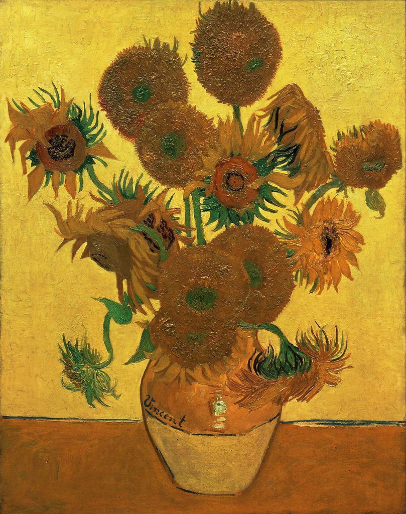 画面上朵朵葵花夸张的形体和激情四射的色彩,使人头晕目眩。他内心充满激情地去画那些面朝太阳而生的花朵.花蕊画得火红火红, 就像一团炽热的火球;黄色的花瓣就像太阳放射出耀眼的光芒一般.画家用奔放不羁、大胆泼辣的笔触,仿佛使其中的每一朵向日葵都获得了强烈的生命力,在这里你用“栩栩如生”来描绘这些向日葵,已经显得软弱和浅薄,因为那火焰般的向日葵仿佛是一朵朵燃烧的生命,画家赋予它们一种生命蓬勃燃烧的冲动和张力。