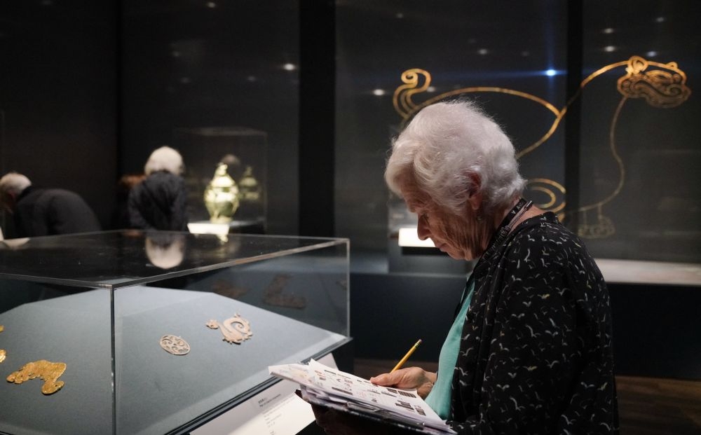 观众在美国旧金山亚洲艺术博物馆举办的“凤凰故国——青铜时代曾楚艺术展”上参观。新华社记者吴晓凌/摄