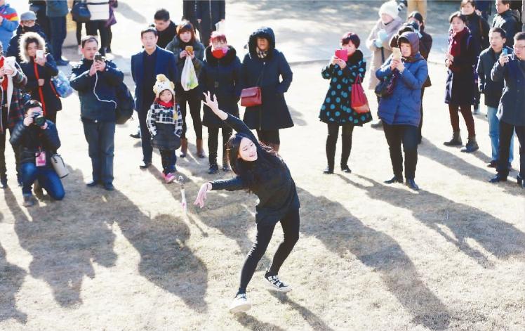 -参加北京电影学院艺考的考生在场外表演才艺-