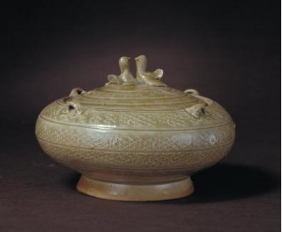 盖缸敛口,扁腹,圈足外撇,肩部四面各饰一条形系。外壁模印菱形锦地网格纹,间饰划线弦纹。器物内外皆施青釉,圈足内素胎无釉。盖圆形,盖口可以合于缸口内。盖面饰3周凹陷的宽弦纹,盖顶雕塑一对小鸟,情态活泼可爱,展翅翘尾相对而立,栩栩如生。此器为西晋时期所制,属于南方青瓷越窑系,造型新颖别致,反映出当时工匠们高超的制瓷技艺。