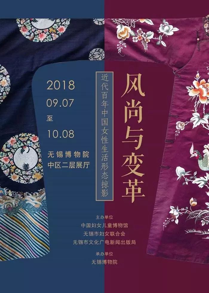 “风尚与变革--近代百年中国女性生活形态掠影”于2018年9月7日至2018年10月8日在无锡博物院中区二层展厅举行。本展览以女性生活形态的变迁,作为透视百年间中国社会变化的一个窗口,映现旧纲维的逐步解体以及新秩序的逐步建立。