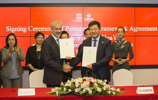 9月23日下午,联合国教科文组织文化助理总干事埃尔乃斯托·奥托内·拉米雷斯(Ernesto Ottone Ramirez)一行到访北京,对近年来中国在非遗文化传承与保护方面取得的成绩表示认可,并与中国非遗保护协会副会长、永新华控股集团董事局主席李永军先就继续深入合作签订了合作框架协议。埃尔乃斯托·奥托内·拉米雷斯还表示,联合国教科文组织欢迎民营企业加入到非遗保护事业中来,期待永新华韵作为联合国教科文组织全球领域的合作伙伴,共同做好非遗传承和保护工作,促进中国和全球非遗事业的发展。