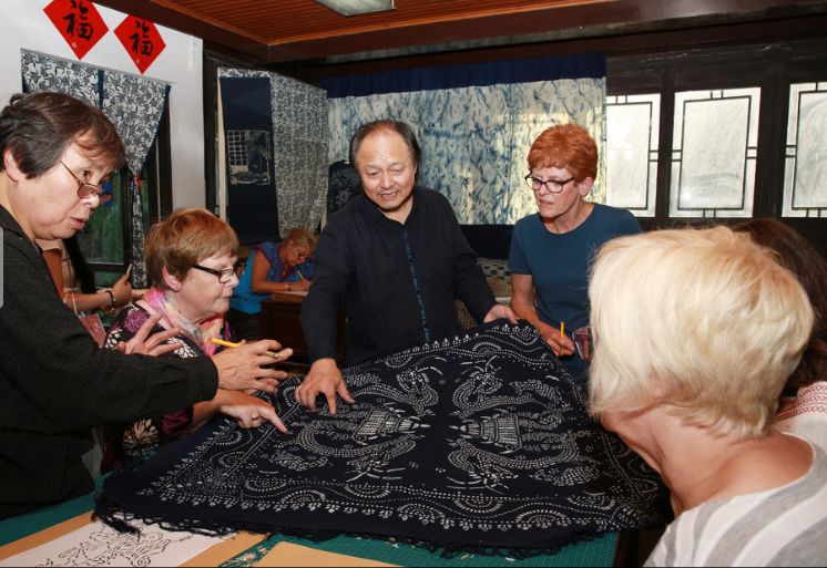 2018年9月24日,从事纺织、文物保护等职业的英国纺织学会会员大多数来自大学教授、博物馆纺织修复专家、服装设计师等是第一次来到南通。当日下午,中国工艺美术大师、首批国家级非物质文化遗产代表性传承人、南通蓝印花布博物馆馆长吴元新;国家级非物质文化遗产南通蓝印花布印染技艺市级传承人倪沈键以及蓝印花布博物馆工作人员与她们一起从刻版、刮浆、染色、刮白以及木版夹缬各道工序全方位体验、学习和交流蓝印花布印染技艺,感受中国非物质文化遗产的魅力。