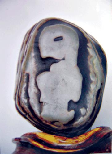 《人之初》这块奇石石质细腻,通体四周是黑白相间的条纹框,框内画面是一个惟妙惟肖的还处于早期胚胎阶段的胎儿形象,眼睛已经发育,其它器官以及四肢尚不明显。整个形象犹如静静蜷坐在母腹中熟睡的婴儿。这块奇石坚硬但表面非常光洁平滑,却完全出于天然,没有经过任何人工打磨抛光,而是长期被水流冲刷的结果。这块寓意着生命的石头取名为《人之初》,一直“沉睡”于黄河上游循化撒拉族自治县一带的河床。