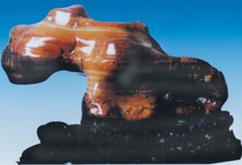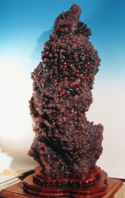 《钟馗》6500万元的中国第一葡萄玛瑙石“钟馗”是一块在石界具有很高知名度的奇石。“钟馗”慨然仰天,英姿勃发,其头顶官帽,身披战袍,一身疙疙瘩瘩恰似刀枪不入的铮铮铠甲,平添几分杀气。若光线强烈,七色幻彩可透体而出,“钟馗”巍然而立,高116厘米,宽48厘米,厚52厘米,约200公斤重,如此巨大而又威猛的造型石,为葡萄玛瑙之罕见。