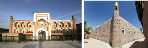 此次修复项目对象阿米尔·图拉经学院和哈桑·穆拉德库什别吉清真寺两栋文物建筑为内城南北轴线上具有代表性的伊斯兰公共建筑。阿米尔·图拉经学院由穆罕默德·拉希姆汗一世的儿子阿米尔·图拉于1870年建造。建筑坐东朝西,整体平面为“回”字形格局,围合中部庭院空间,是伊斯兰经学院建筑的典型形制。经学院建筑东西长51.4米、南北宽36.8米,建筑主体高约6.8米(现地面露出部分),西部入口高约14.5米(现地面露出部分),占地面积1980平方米,建筑面积约3000平方米。经学院建筑内主要的功能包括中央大厅、教室和寝室,共有约50个房间。哈桑·穆拉德库什别吉清真寺建造于18世纪晚期。清真寺主体建筑坐南朝北,主体由礼拜堂和宣礼塔构成,是希瓦古城小型清真寺的典型形制。建筑整体东西14.3米、南北16.3米,主体高约7米(自原始地面)。