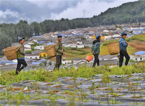 四川省凉山彝族自治州布拖县拖觉镇老吉村的妇女在去往蓝莓种植基地务工的路上(2020年8月13日摄)。新华社记者 刘坤 摄