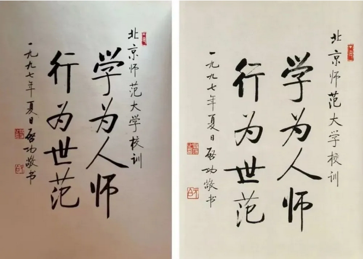 北师大校园内的校训碑是启功还在世时立的原碑,把上面的书法与学生证上的对照,证明了学生证上的启功书法确是伪作。