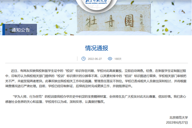 据北京师范大学官网6月27日消息,北京师范大学就此事发布情况通报:近日,有网友反映我校新版学生证中的“校训”标识存在问题,学校对此高度重视,立即启动调查。
