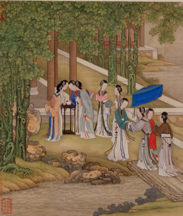在清代陈枚的《月曼清游图册》中,他描绘了宫廷嫔妃们一年十二个月的深宫生活,其中七月的部分,描绘的正是“桐荫乞巧”的画面。