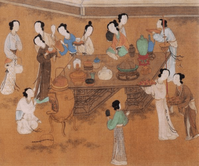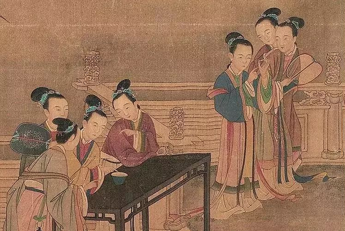 图画中,仕女们在进行着把针放到盛满水的碗里的游戏,据说针在水面形成的图案越好看,放针者的手越巧。