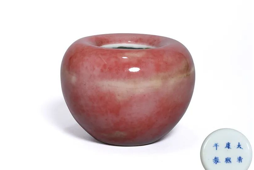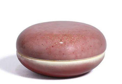 这件清康熙豇豆红釉印盒,在桃花般红色的釉面上泛出青色苔点,被形容为:“满身苔点,泛于桃花春浪间”。