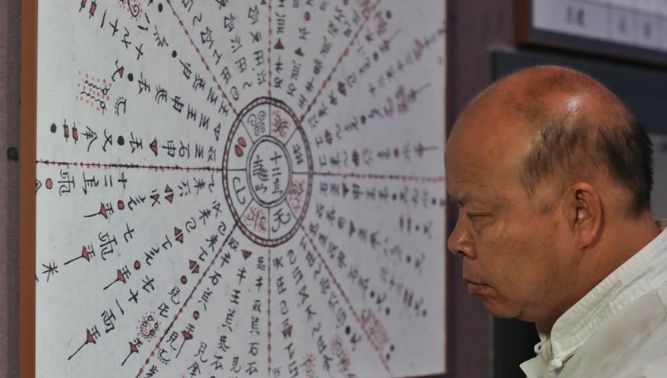 7月3日,三都县水书文化研究院的工作人员韦仕钊在观看水族文化博物馆内的水书展板。 水书是水族的传统文字,记载了水族的天文、地理、民俗、伦理、哲学、美学等文化信息,被称为水族的“百科全书”。水书是类似甲骨文和金文的古老文字符号,被称为象形文字的“活化石”,2006年被列为国家级非物质文化遗产。