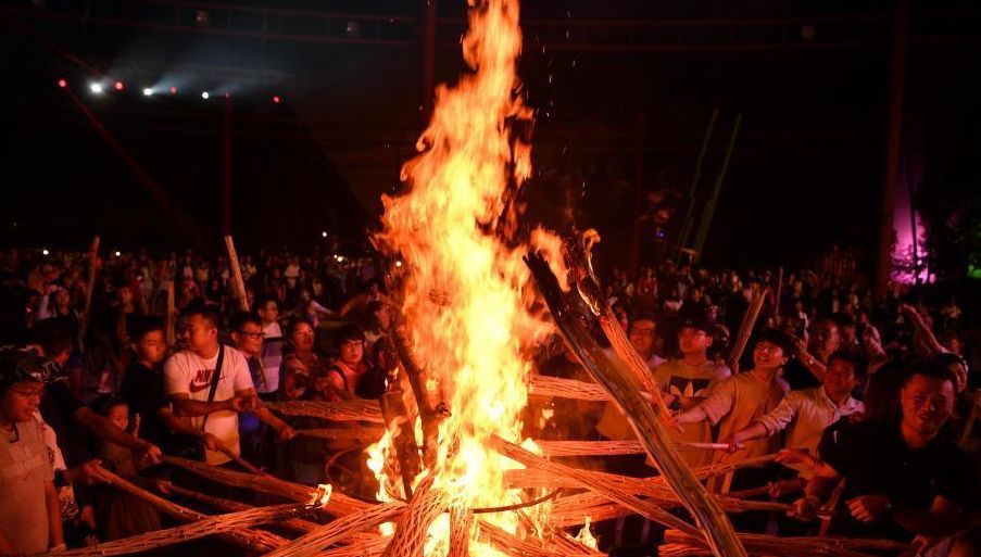 7月21日,游客点燃手中火把。当日晚,云南民族村举行2019昆明火把节狂欢活动,来自各地的游客踩着欢快的音乐,在火的海洋中与少数民族民众一起共度“东方狂欢节”。火把节是彝族、白族、纳西族、拉祜族、哈尼族、普米族等民族的传统节日,在农历六月举行,节期二至三天。
