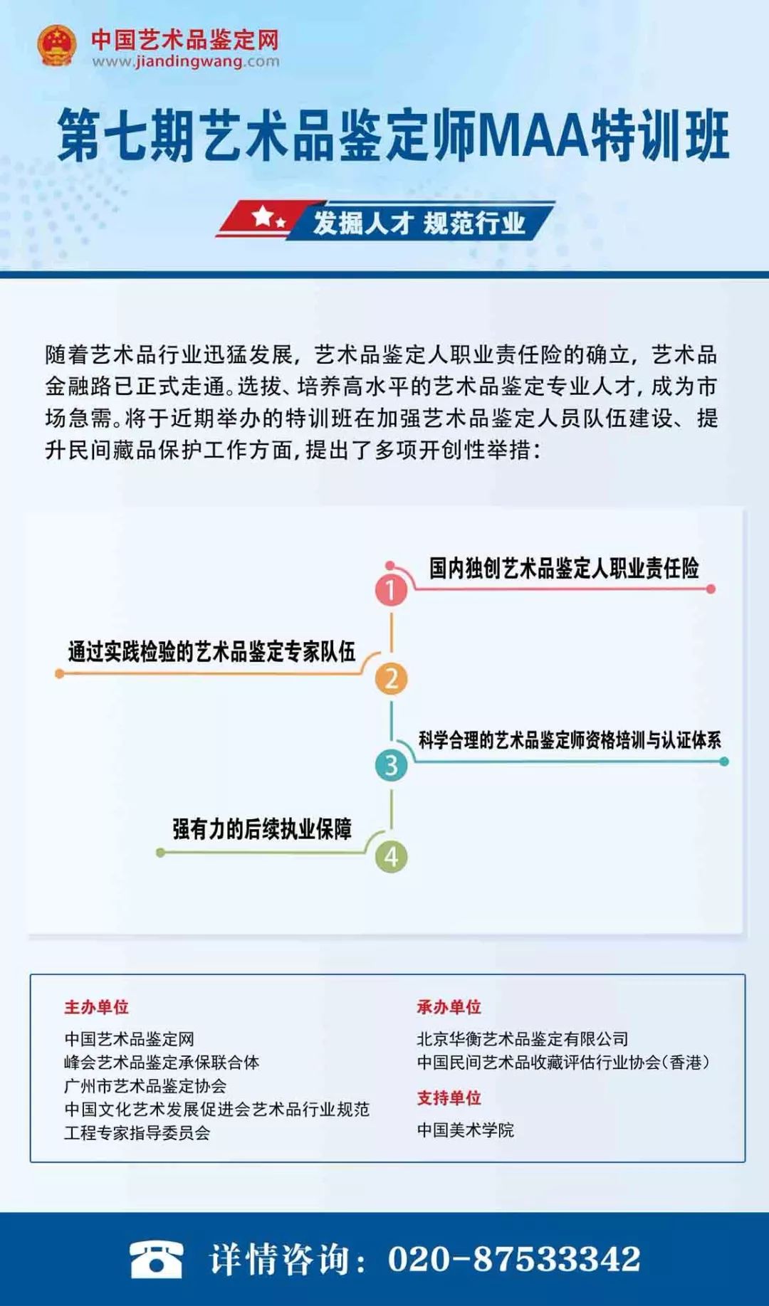 为此,中国艺术品鉴定网、峰会艺术品鉴定承保联合体、广州市艺术品鉴定协会、中国文化艺术发展促进会艺术品行业规范工程专家指导委员会将于近期联合举办第七期“艺术品鉴定师MAA特训班”。