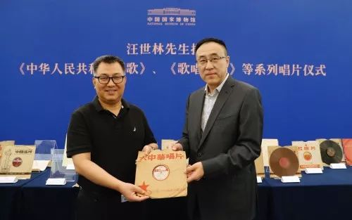 8月5日下午,汪世林向国家博物馆捐赠了包括《中华人民共和国国歌》《歌唱祖国》两个系列不同版本的33 张唱片及文献资料。其中两张唱片尤为珍贵:一张是1949年12月录制的第一张《中华人民共和国国歌》样片;另一张是1951年9月底录制的第一张《歌唱祖国》内部发行的唱片及唱片上报文件。