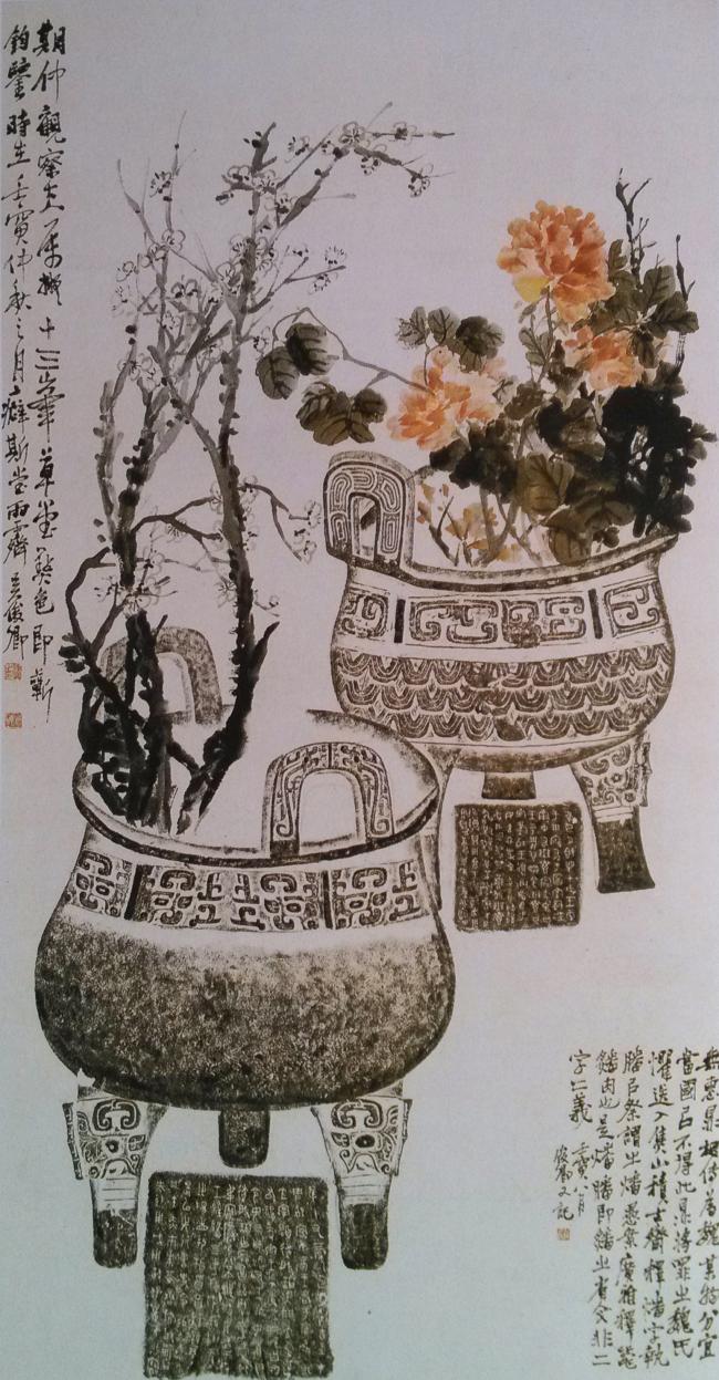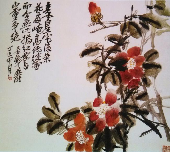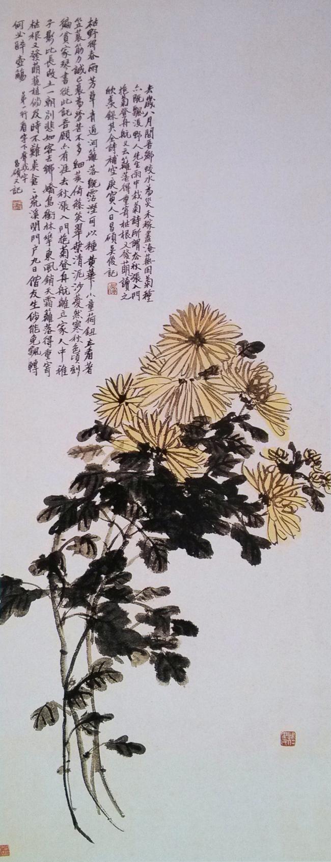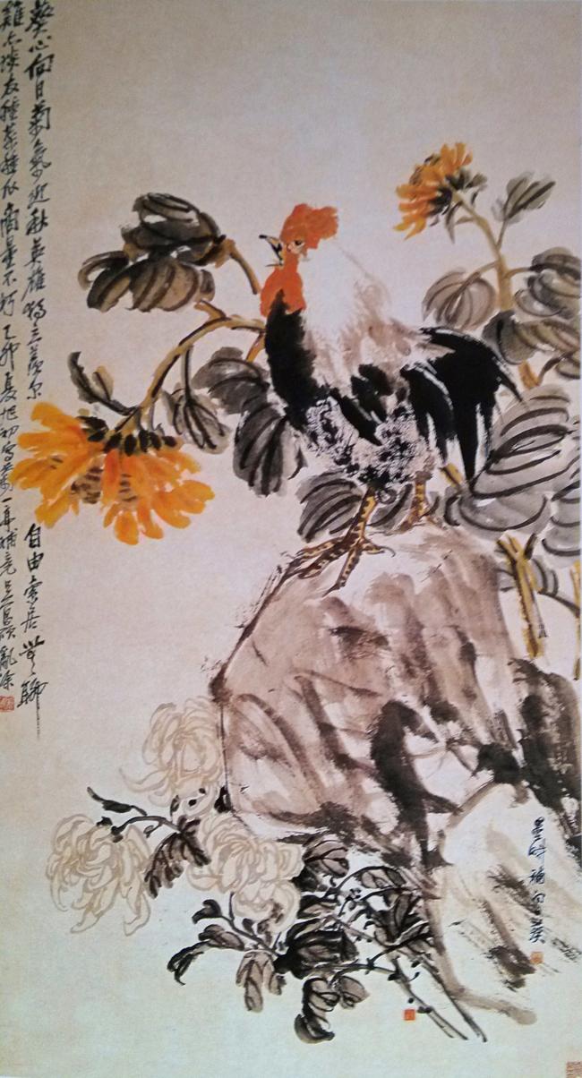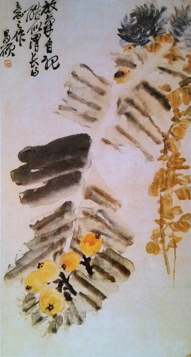 吴昌硕(1844.8.1-1927.11.29)原名俊,字昌硕,别号缶庐、苦铁等,汉族,浙江安吉人。我国近、现代书画艺术发展过渡时期的关键人物,诗、书、画、印等四绝的一代宗师,晚清民国时期著名国画家、书法家、篆刻家,与任伯年、赵之谦、虚谷齐名为清末海派四大家。吴昌硕的艺术别辟蹊径、贵于创造,最擅长写意花卉,他以书法入画,把书法、篆刻的行笔、运刀、章法融入绘画,形成富有金石味的独特画风。他以篆笔写梅兰,狂草作葡萄,所作花卉木石,笔力敦厚老辣、纵横恣肆、气势雄强,构图也近书印的章法布白,虚实相生、主体突出,画面用色对比强烈。